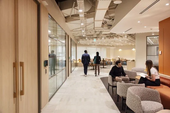 The workplace incorporates a strong sustainability focus, targeting 6 Star Green Star Interiors certification and incorporating low-carbon design initiatives.
